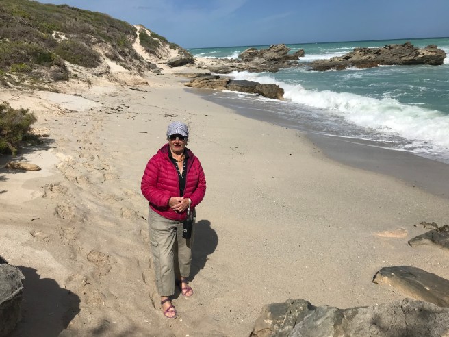 Wir kommen zum Parkplatz. Dieser ist gut gefüllt, obwohl wir auf dem Weg nur einem LKW begegnet sind. Bepackt mit Wasserflasche und Fernglas gehen wir zum Strand und wandern eine Weile, setzen uns und beobachten die Wellen. Immer in der Hoffnung Wale zu entdecken. Tatsächlich sehe ich schwarze Schatten auf und nieder. Doch nicht wirklich.