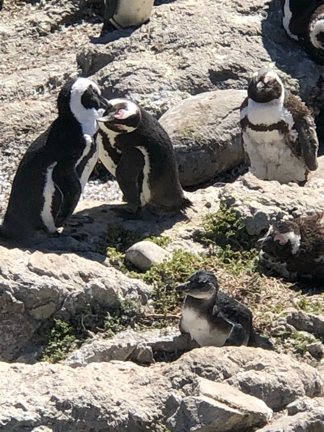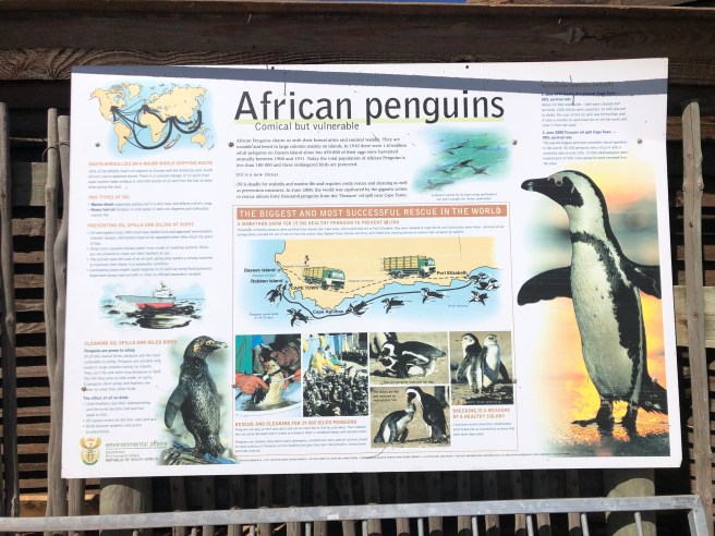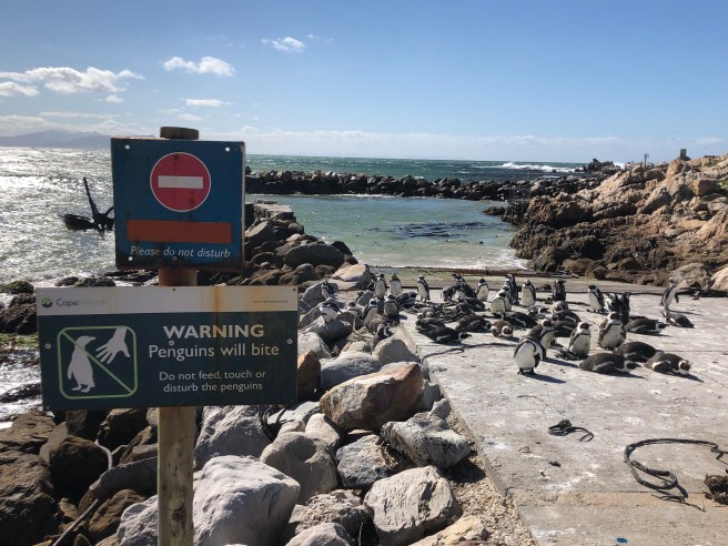 So soll es sein. Frühstück um acht Uhr. Pünktlich um 8:30 h sitzen wir im Auto und es geht über die N2 Richtung Betty’s Bay. Hier finden wir Schilder, die uns zum Strand lenken, auf welchem wir die afrikanischen Pinguine finden.