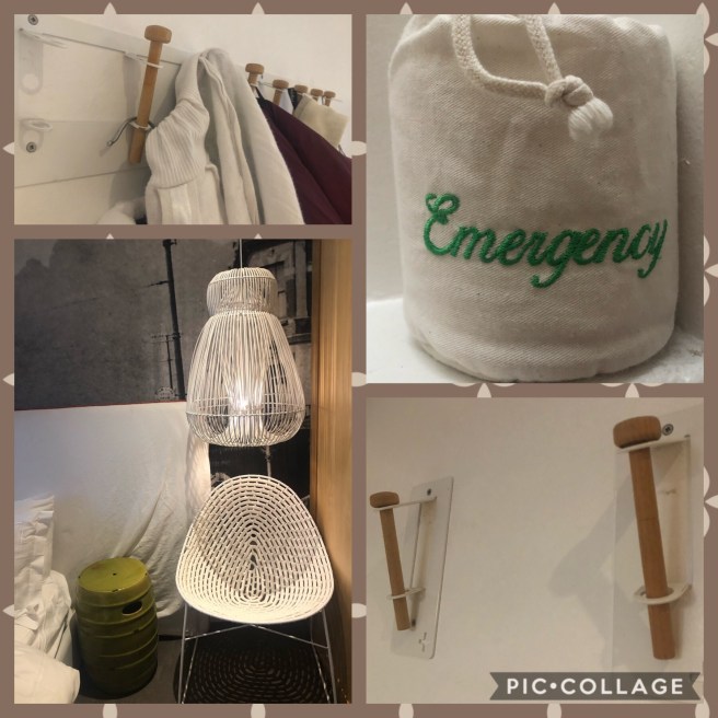 Die Kleiderhaken aus Holzstiften, der Porzellan Nachttisch in Form eines Fasses und die Ersatz-Klorolle im „Emergency“ Stoffbeutel. Dieses Appartement ist sehr geschmackvoll und liebevoll eingerichtet.