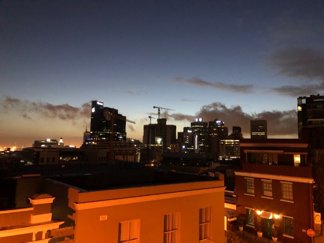 Mein Blick um 5:30 h – Capetown erwacht. Die Sonne kämpft sich bereits durch die Wolken.
