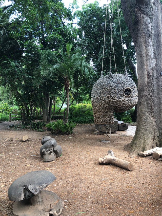 Diesen Spielplatz fand ich besonders. Einmal waren keine Kinder dort am Sonntag morgen, zum anderen war es Natur belassen, mit Geräten und Materialien aus der Natur. Auf der anderen Seite hängt noch ein Kokon. Da müssen wir doch mal anfangen aus Weide zu flechten.