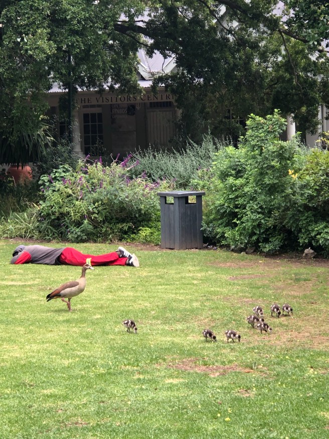 Dieses Bild gab es häufig. Farbige liegen einfach auf den Wiesen, am Straßenrand, z.T. in Arbeitskleidung und schlafen. Die Entenfamilie lässt das kalt.