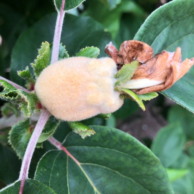 Eine Hecke blühte mit dieser Frucht, die die Mitarbeiter nicht benennen konnten. Maracuja (Passionsfrucht) ist es nicht.