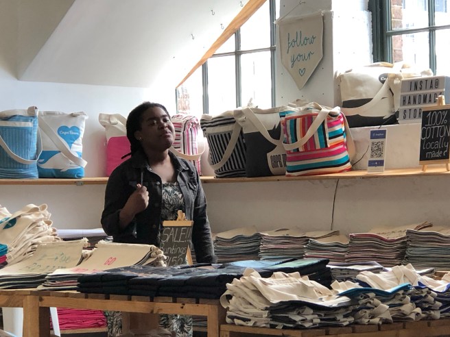 In diesen beiden kleinen Hallen direkt an der Waterkant werden traditionelle Speisen und Produkte aus kleinen Werkstätten angeboten. So wir hier, schön bedruckte Taschen, Tücher und Wimpel. Am