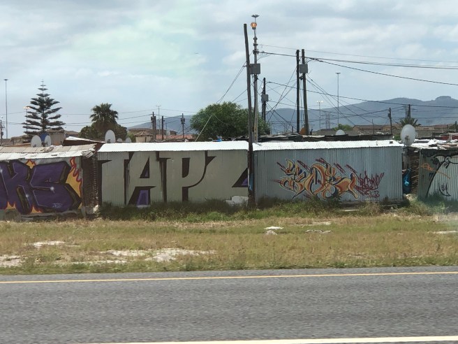 Ein letzter Blick auf das Township. Neben ganz hübschen, bunt bemalten Häuschen aber wieder viele, viele Blechhütten.