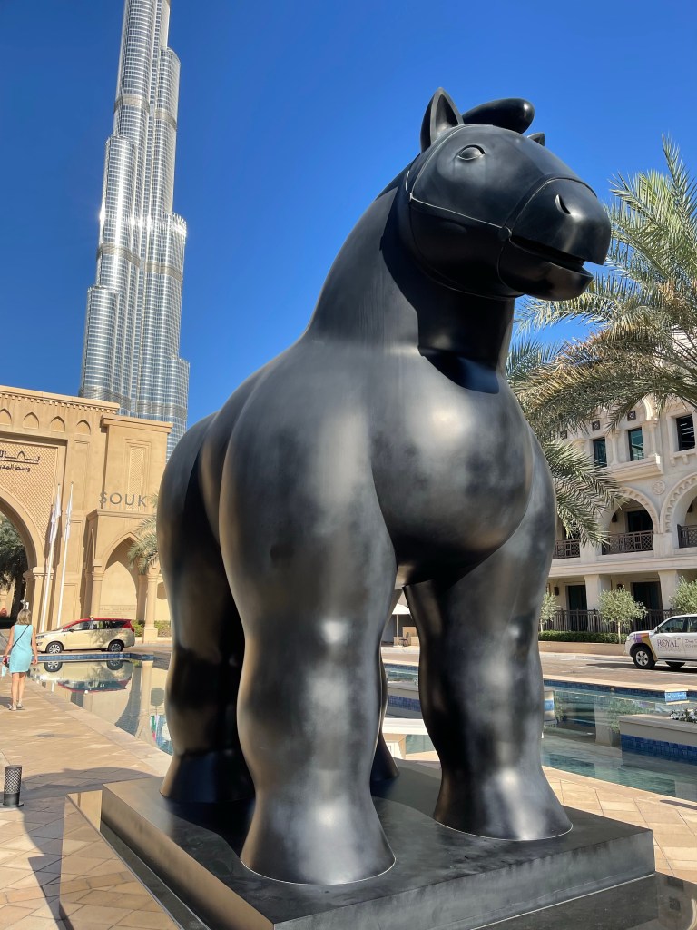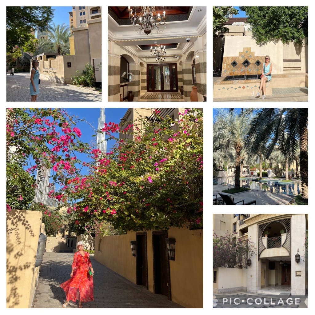 Dann zieht es uns wieder ins Arabeska zum Frühstück. Die flache, sandfarbene Gebäudestruktur reizt mich. So suchen wir einen Eingang in das Wohnviertel. „The old town/ Manzin“. Es ist sehr sauber, wunderschön, grün und ruhig hier. Es könnte auch auf Mallorca sein, wenn nicht die arabischen Elemente sichtbar wären. Wir schauen in einen Hausflur. Mega edel, Marmor, Beleuchtungen wie in 1001 Nacht! Sehr schön. Pool natürlich, Brunnen vor der Tür. Die roten und weißen zarten Bouganvillen ranken an und über den Mauern. Burj Khalifa als Hintergrund. Dieser kleine entspannte Spaziergang bringt Ruhe in die unruhige und äußerst laute Stadt.