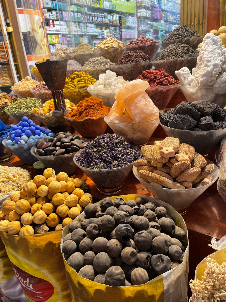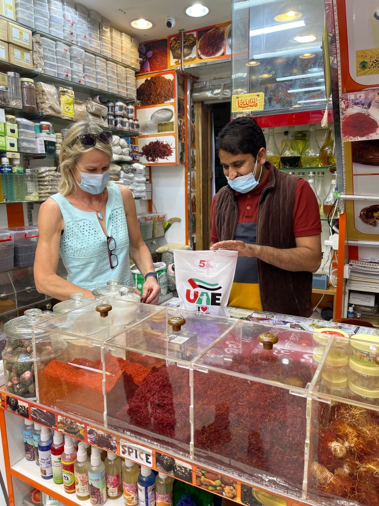 Wir wandern weiter. Gehen dann aber wieder zurück und geben unsere Bestellung auf. Preise werden verlangt jenseits von gut und böse. 100 Gramm Tee: 100 Dirham / 25 Euro (wir handeln auf 35,- Dirham runter) so geht es mit allen anderen Produkten auch. Ein langwieriger und quälender, auch witziger Prozess durch den Viola sich durcharbeitet. Die Übung in China war der beste Lehrmeister. Doch nerven tut es doch. Zum Ende gehen wir mit einem guten Gefühl. Der Verkäufer ist der Verzweiflung nahe. Unter den arabischen Preisen. Viele Araber kaufen hier während wir in der Verhandlung sind. Mein bester Moment heute, als Viola und der Händler sich die Hand auf den Handel geben. Wie er sagt: Du bist eine gute Händlerin und bald Tränen vergießt. Ich kann nicht mehr. Des öfteren muss ich das Grinsen verkneifen und ernst bleiben. Viola ist neben Carina die beste Händlerin die ich kenne. Ende Gut alles gut. Diesen Spruch nenne ich bald noch öfter 🙂