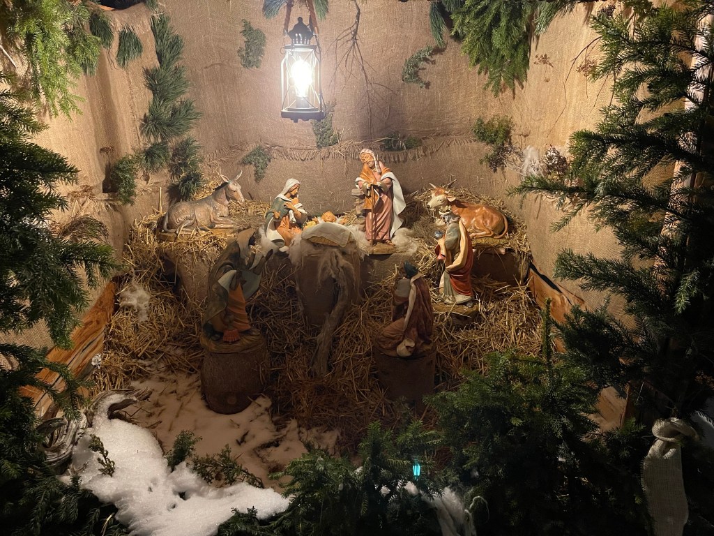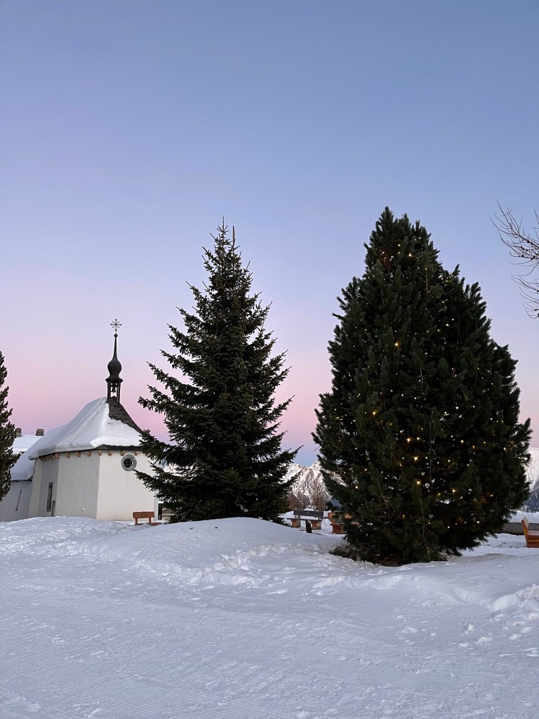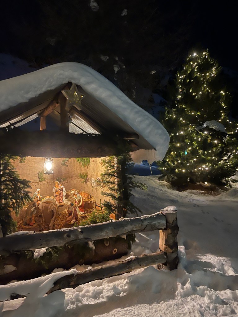 Da flitzen die vier Richtung Kapelle und sehen einen Stall zwischen den beleuchteten Tannenbäumen.