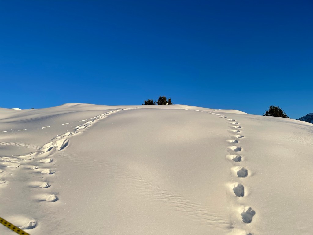„Was könnte das sein?“ die vier überlegen, welche Tiere wohnen denn über 2000 hoch im Winter? Schneehasen, Fuchs, Gämse fallen ihnen ein. Murmeltier? Nein, die verschlafen den Winter in der Höhle. Dachs vielleicht, Hirsche. Ne, die sind weiter unten im Tal. Wir müssten uns mal auf die Lauer legen und warten, bis die Tiere hier herumlaufen.