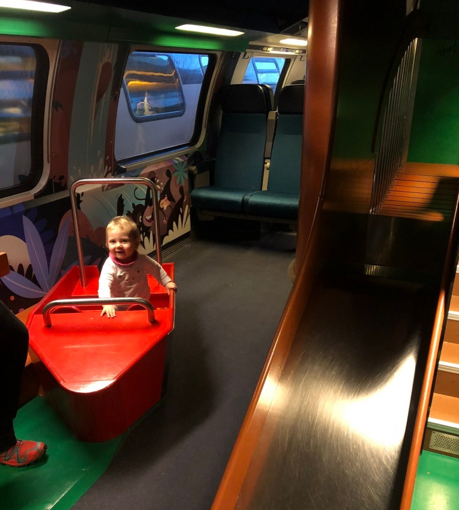 Im Schweizer Zug gibt es sogar ein Spielabteil. Hier finden es die vier ganz toll. Sie rutschen, setzen sich ins Boot und spielen vergnügt. So vergeht die Zeit wie im Flug.