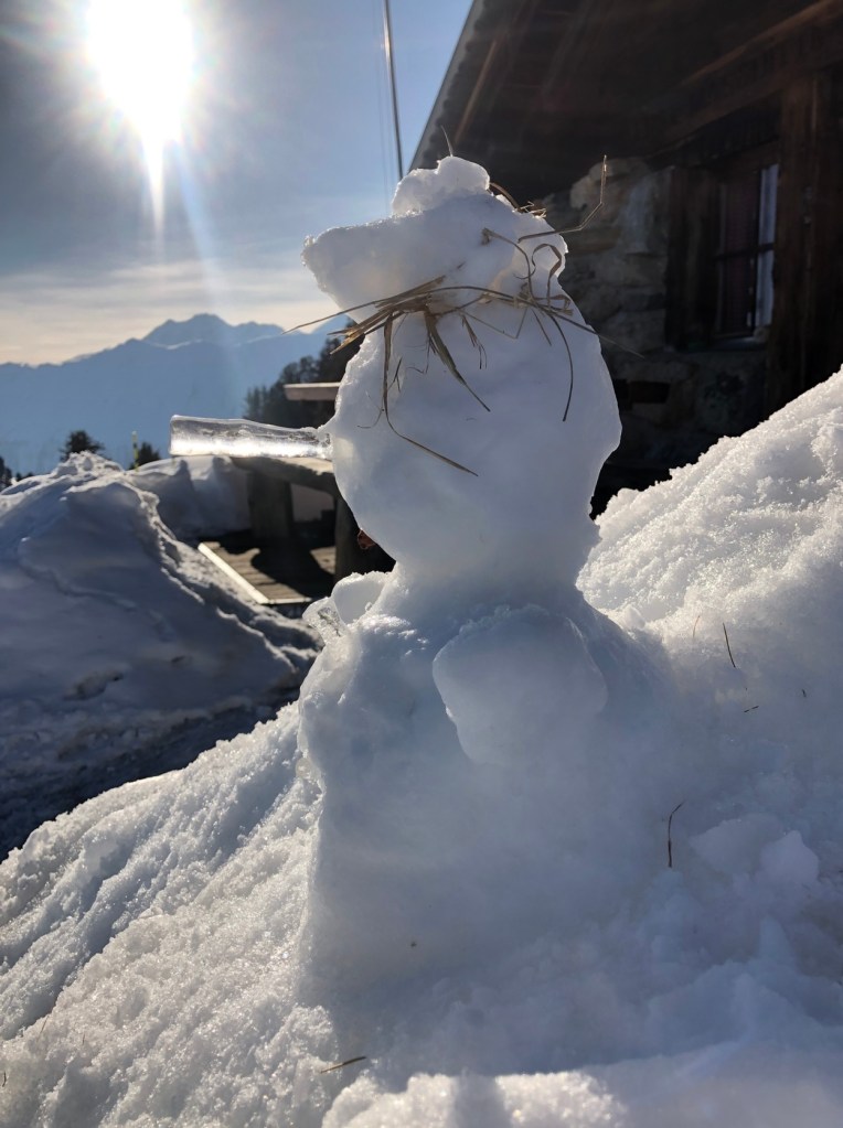 Ein Schneemann! Wer hat den wohl gebaut? Der hat ja eine Eisnase! Und eine Wuschelfrisur aus Stroh. War das wohl Gletschi? „Ich glaube, Gletschi gibt es gar nicht!“ sagt Finn. „Ach ist doch egal, ob wir ihn finden oder nicht. Es ist doch ganz toll hier.“ „Habt ihr auch schon mal einen Schneemann gebaut?“ fragt Milian. Eleni meint, ja vielleicht, aber Lelia kann sich an den letzten Winter erinnern. „Ich war mit meinem Papa am Hegenscheid im Schnee. Da haben wir ganz tolle Schneemänner gebaut!“