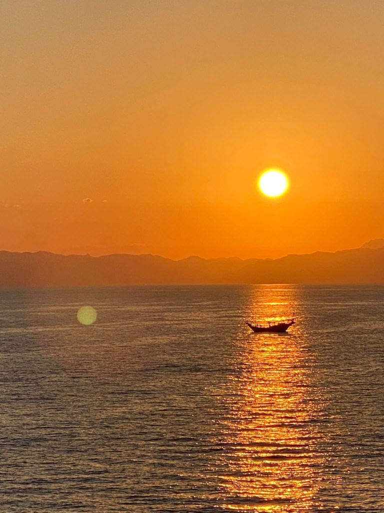Die Sonne geht auf – eine Dau fährt in den Sonnenaufgang