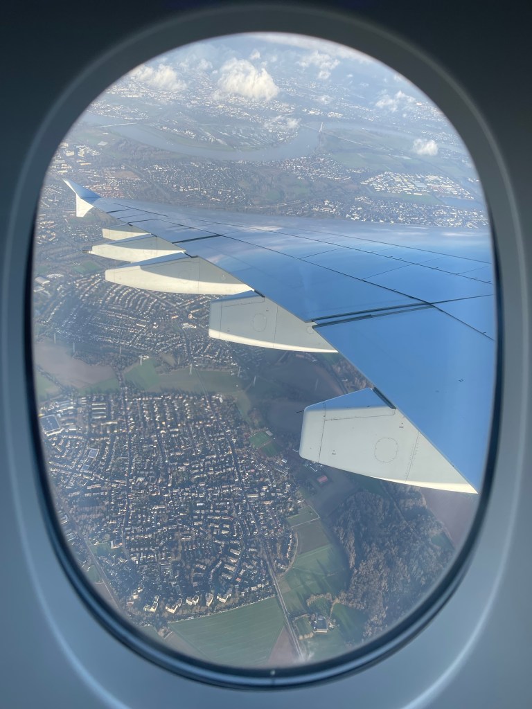 Es fühlt sich alles so unwirklich an. Visa, PCR-Test, Mails vom AirB&B Bewohner. Wirklichkeit? Traum? Ich bin aufgeregt wie selten zuvor vor einer Reise. Endlich wieder in die Ferne schweben. Bei jedem Hinweis, jeder Mail: Herzklabaster: wird diese Reise auch wieder abgesagt? Bislang nein. 8:30 h geht es los. Vorfreude steigt. Viola holen wir ab. Peter winkt, wünscht uns eine gute Reise und Toni wedelt mit dem Schwanz und weiter geht es Richtung Dortmund. Alle meinen es gut mit uns. Die R1 fährt pünktlich um 9:45 h ab. 10:32 h sind wir in Düsseldorf am Flughafen. Wow!!!