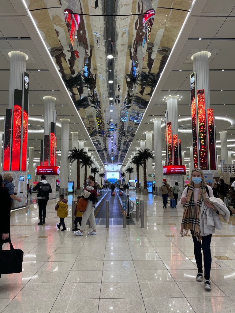Ankunft, 23:45 h Dubai – vor der angekündigten Zeit. Alles super, es geht in einem durch die imposante Ankunft- und Gepäckhalle. Auf irgendeiner Zwischenlandung war ich bereits schon mal hier und kann mich an das ein und andere erinnern. Die riesigen Hallen, Wasserfälle, Fahrstühle und Bahnen zu den nächsten Terminals.