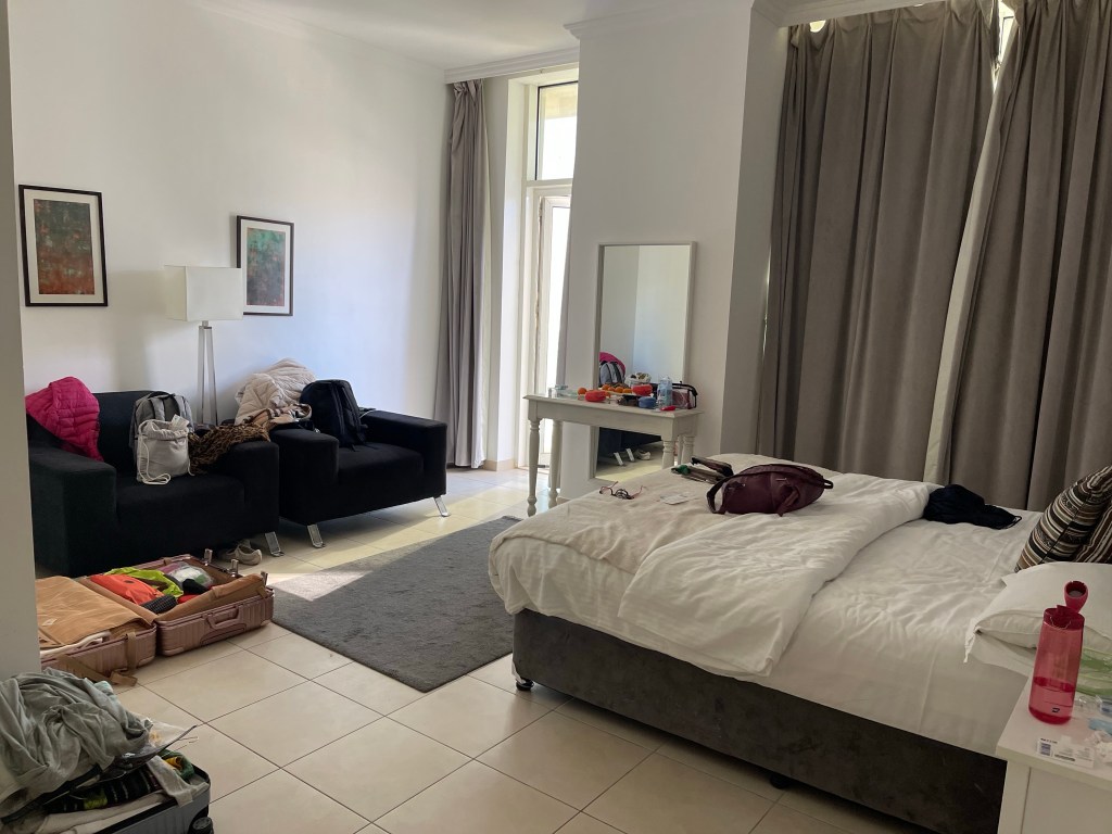 Wir wohnen in einem Miniappartement in einer Wohnung mit drei Herren aus Pakistan? Wenn wir unseren Vermieter korrekt verstanden haben. Das Appartement ist sehr oK. Ich denke immer, die geben so viel Geld aus für alles. Aber für meinen Geschmack: Außen hui und innen pfui. Das Badezimmer lässt Wünsche offen. Ein Plastikvorhang (Duschvorhang) dient als Gardine vor dem Fenster :-). Geht auch. Die Silikonfugen könnten komplett erneuert werden. Marmorwaschtisch – naja! Kosmetik/Handwaschmittelbehälter arbabische Optik, made in China. Aber alles unschlagbar günstig: 200 Euro für die beiden Nächte.