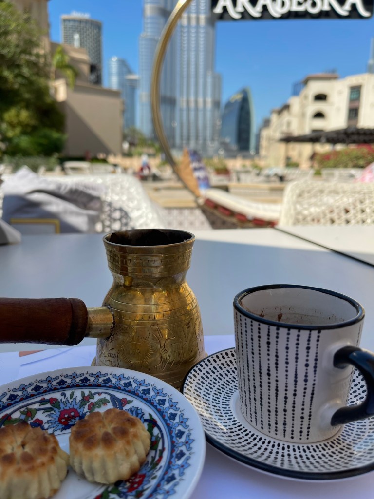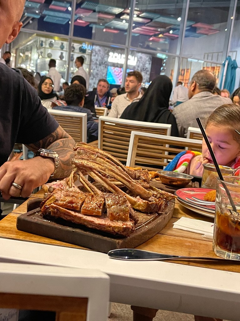 Essen und Drink im Karamna, gleich gegenüber der Dubai Mall. Keine fünf Minuten zu Fuß von der Wohnung. Ich fühle mich, umgeben von den Herren in der traditionellen Kleidung wie im Märchen aus 1001 Nacht. Bald gibt es Quatschgeschichten für Lelia mit weissgekleideten Prinzen und hübschen Prinzessinnen in farbenfrohen Glitzerkleidern. Die bestellten Speisen sind gaumenfreundlich. Nicht zu scharf, Gewürze, die wir kennen. Humus, Linsensuppe, ganz frisches Naan-Brot. Lecker. Die Herren treffen sich hier mit ihren Spirtwagen und lassen diese ordentlich aufheulen beim anfahren.
