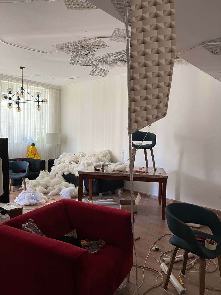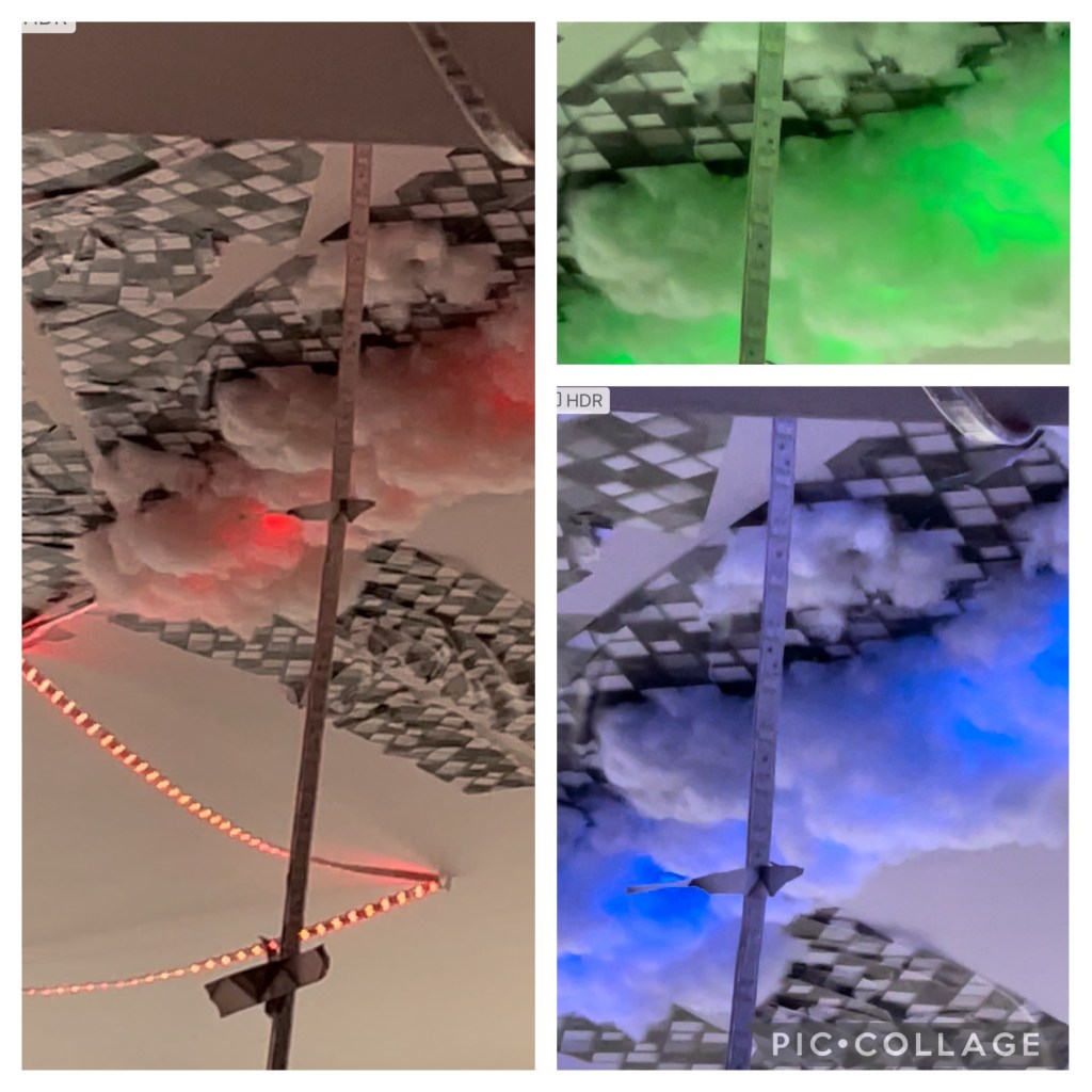 Wir schlucken dreimal und denken laut: na, die werden hier wohl nicht mehr lange wohnen bleiben. Einer der Bewohner klärt uns auf. Es ist eine Deko-Installation. Disco-like. CloudKits-Wolkenbilder beleuchtet. Ahhh, deshalb ging die Feuer-Sirene um 5 oder 6 an. Verrückte junge Leute.