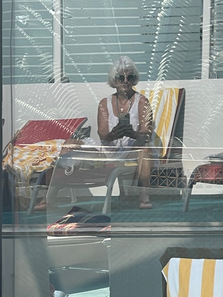 Dann gehe ich erstmal schwimmen. Schit! Das Netz ist noch auf den Pools. Um 8:50 h kommt der Mitarbeiter und entfernt das Netz, so dass ich nach meinem ersten Cappuccino ins kühle Nass hüpfen kann. 21 Grad gibt der Kapitän bei der morgendlichen Hafeninformation durch. Mein Körper glüht in der prallen Sonne und denkt: „Das sind mehr als 21 Grad. Gleich zischt es bestimmt, wenn ich ins Wasser steige.“ dann lassen wir den Tag mal kommen, Viola stößt auch zu mir. Guten Morgen liebe Sonne.