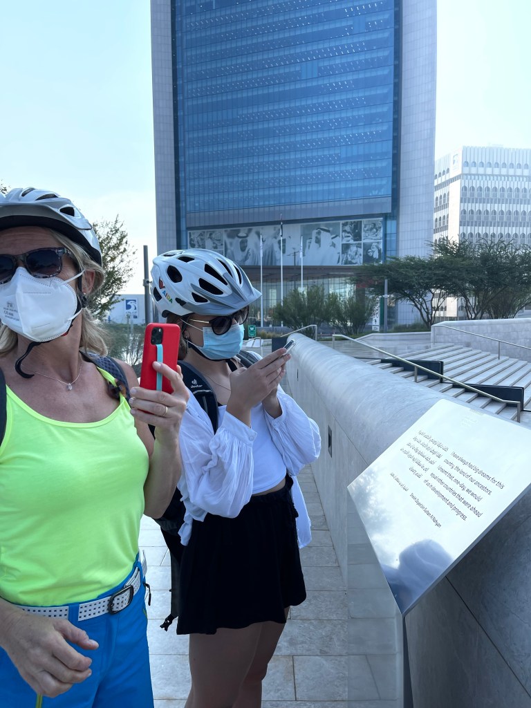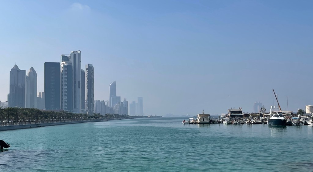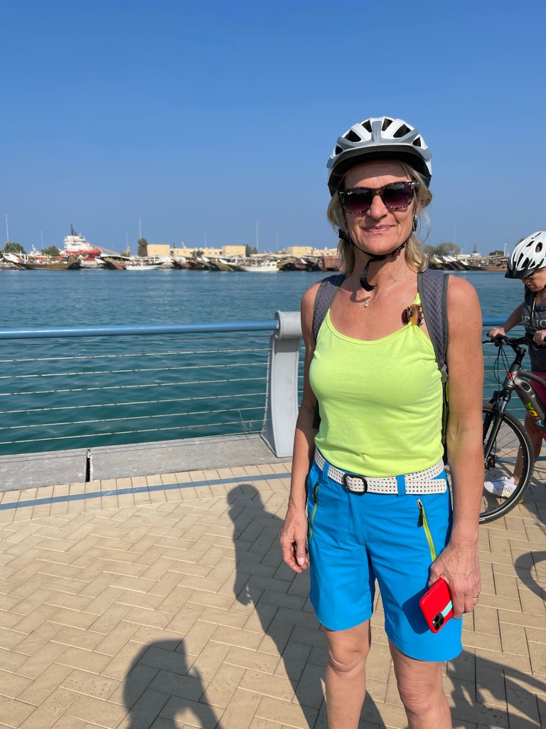 7 Uhr aufstehen, den ersten Kaffee, in „Venedig und Paris herumspazieren“, in meinem Buch die Glasbläserin von Murano. Pünktlich um 8 Uhr schwimmen. Viola versucht es auch noch mal. Schade, dass man nach 30 Minuten Abkühlung diesmal nicht in die Sauna darf. Schade. So frühstücken wir wie gewohnt bei „Dwight Navidad“, bevor es um 10 Uhr auf das also geht. Mit dem Pedelec durch Abu Dhabi.
