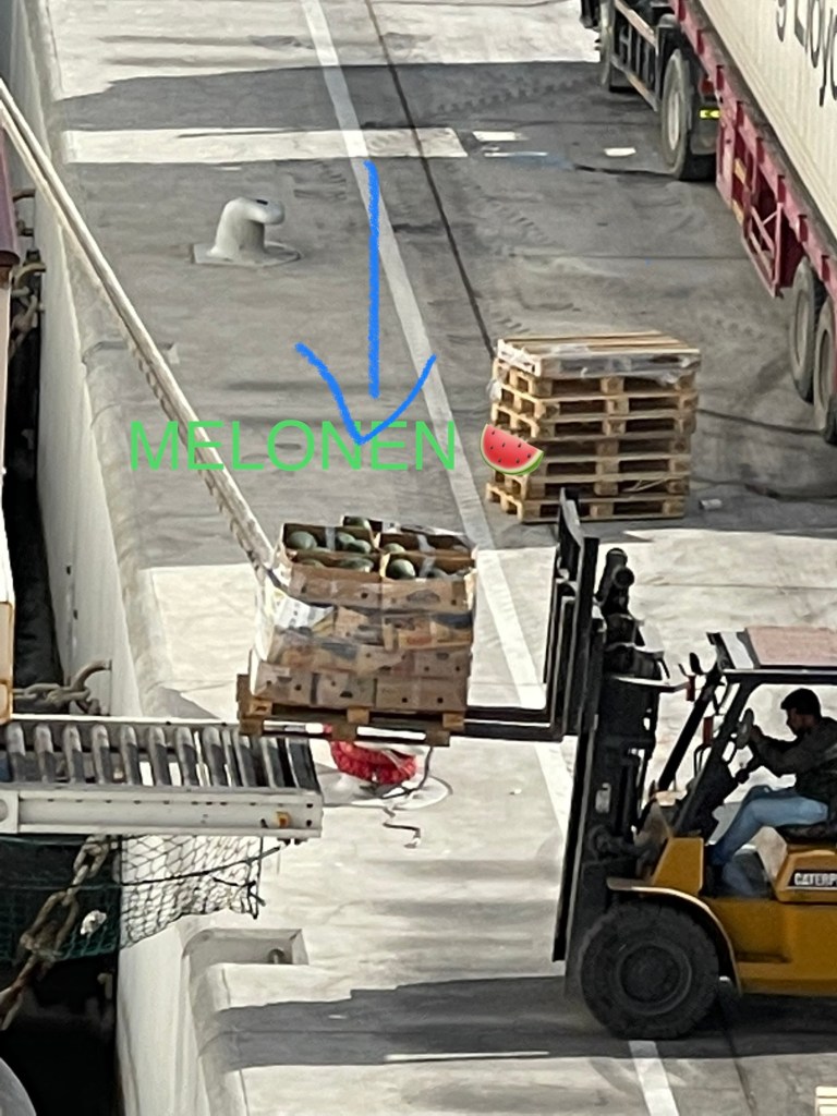 Futter an Bord Eine ganze Palette frische Melonen – unfassbar, diese Mengen!