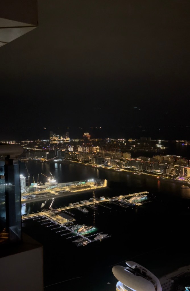 ein letzter genussvoller Tag an BordNun lassen wir den Abend mit Sushi und einem köstlichen Getränk ausklingen. Unten rechts zeigt der Finger auf den ‚Princess Tower‘, unser Zuhause für die nächsten Tage. Gute Nacht!
