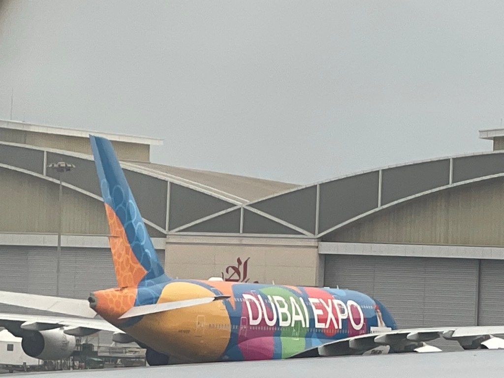 Auf der Fahrt Richtung Startbahn sehen wir einen ganz bunten Flieger. Das bringt uns direkt zurück zur EXPO zum Emirates Pavillon. Hier durften wir unser persönliches Flugzeug Modell entwerfen. Vielleicht gab es schon einen Gewinner, dessen Maschine umgehend umgesetzt wurde.