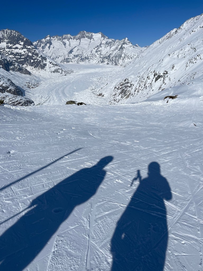 Wir haben einige humoristische Momente erlebt mit Skifahren auf der Piste. Verkleidungen wie Häschen, Zebras und Pikatschu sind über die Piste gesaust. Ein kleiner zwei Jahre alter Junge fuhr begeistert mit Mama und Papa die blaue Moosfluh Piste. Ein Bähnli Gast am Moosfluh meinte mit einem Liegestuhl komme man schneller unten an als auf Ski. Ein weiterer Gast wurde kurzerhand von zwei echten Freunden an seinen Ski auf den Kopf gedreht und schaute sich nun hängend die Gegend an. Rückwärts fahrende Kinder und einiges mehr. Da die Schweizer und Hamburger Skiferien hatten, waren viele Kinder auf den Pisten. Kein Platz am Tisch, bau ich mir einen Liegestuhl im Schnee. Gämse verschwunden? Die werden bestimmt vom Service Personal als Pappkameraden zu den touristischen Punkten gezogen oder gestellt. Tatsächlich haben wir die dann aber doch noch gesehen. Fünf n der Zahl. Sogar eine auf der Bettmeralp.
