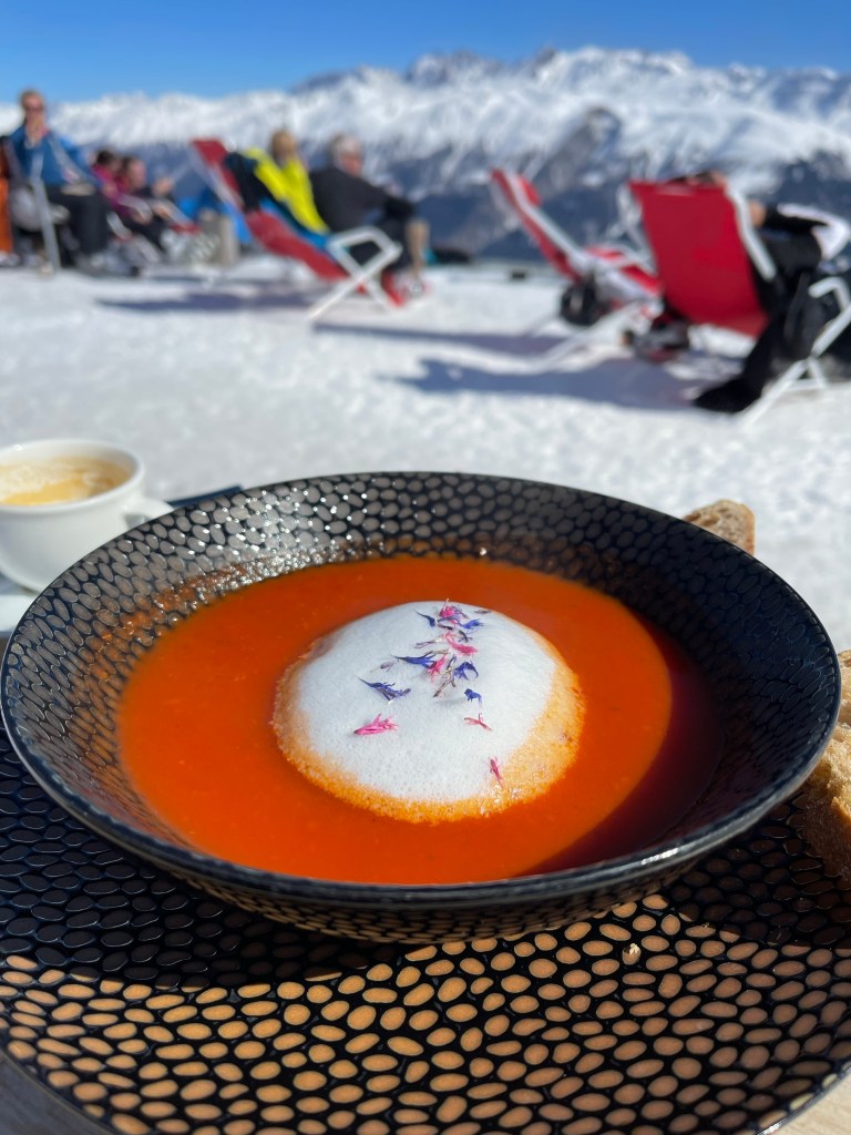 Heidis-Hütte, Fiescheralp / Selbstbedienung aber Tulpen an der ThekeTomatensuppe an Heidis-Hütte – sehr lecker und toll mit Blüten dekoriert