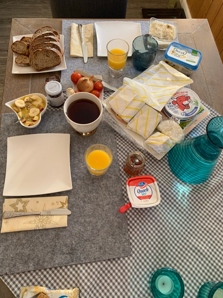 Dann frühstücken, ausgiebig und reichlich. Wir wollen ja gestärkt auf die Piste.
