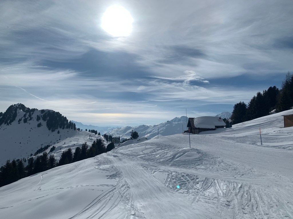 Pausen haben wir in Heidis Hütte gemacht. Gault Millau CH 12 Punkte hat die Hütte . Wir fragen uns wofür? Suppen sind sehr lecker. Brot auch köstlich. Weibe bis 600 Chf im Angebot und Trüffel Spaghetti. Ob das der Grund ist? Oder die Lage?