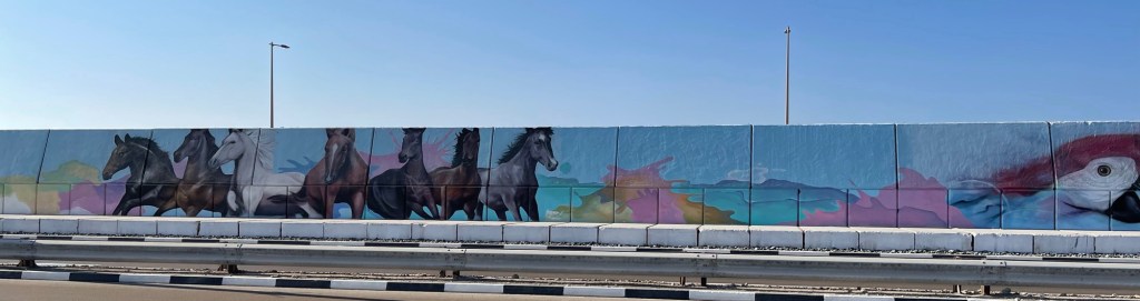 Nach einer Kurzeinweisung starten wir über geniale Fahrradwege Richtung „Corniche“. Unser Guide macht einige Stopps. Im Hafengebiet ist die lange Betonmauer über und über mit Graffitis besprüht.