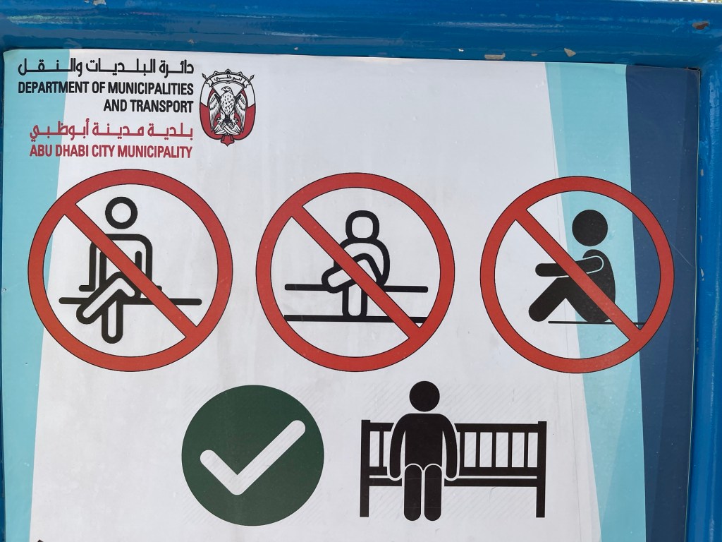 dann. geht es zum Corniche Beach mit vielen Verboten. U.a. dar man sich nur in vorbereiteten Ringen sitzen. ins Wasser dürfen wir jedoch ohne Verbote.