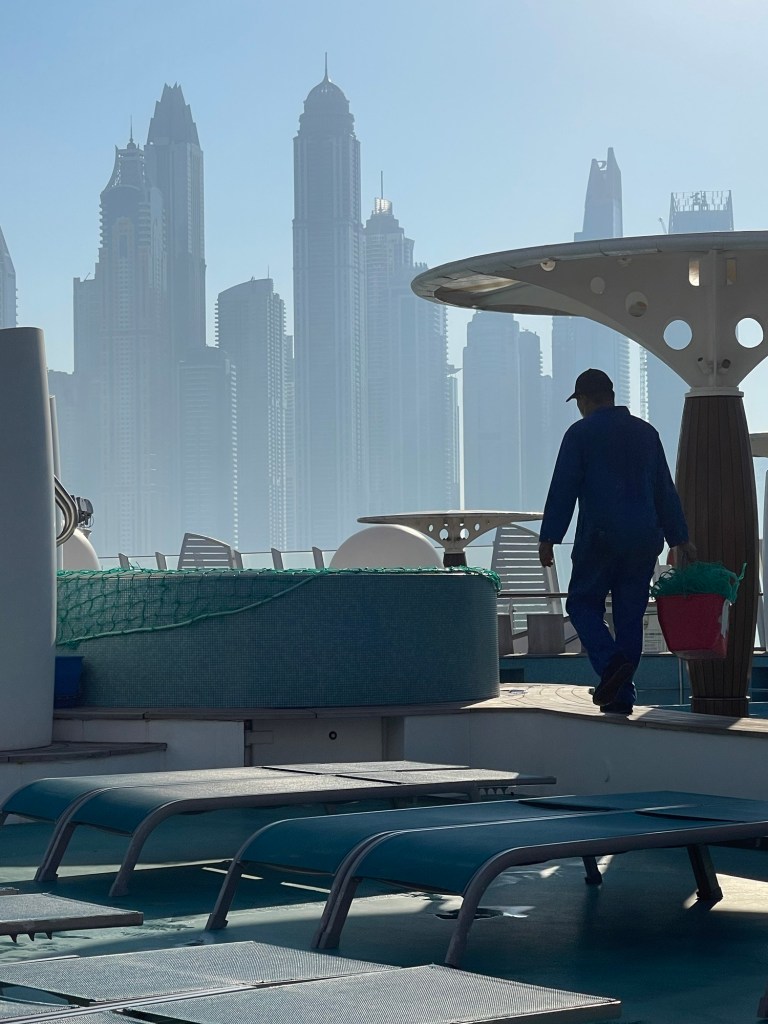Ein traumhafter Arbeitsplatz der Masseure/innen – direkt am BugMit Blick auf die Dubai Palme, trinke ich einen Tee