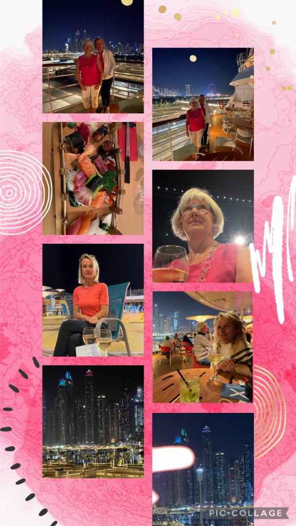 Was steht heute an? 8:15 Sport, dann schwimmen, Frühstück, ohmm Sonne, Lektor, Spinning (Viola), Abendessen, Face Check und zuletzt Ausflug zur Sheik … Moschee. Schöner Plan. Pläne sind zum ändern da 🙂 Gym mit Ball: wir sind nur zu zweit, fällt daher aus. Corona ist überall spürbar. Auch an der Gästezahl. Die Kurse, die sonst nicht mehr belegt werden können, da zu viele Interessenten da sind, finden diesmal erst gar nicht statt. Mindestanzahl: 5 TNinnen. Egal, dann gehe ich schwimmen. Ausgiebig und entspannt ziehe ich meine Bahnen in dem angenehmen Wasser. Ich bin so glücklich, endlich wieder draußen schwimmen zu können. Nachdem Viola gelesen hat, geht sie ins Gym und macht einen Kurs für ihren Rücken. Wir treffen uns in der Kabine um gemeinsam zum Frühstück zu gehen. Ausgiebig genießen wir mit der Freundlichkeit von „Dwight Navidad“ die unterschiedlichen Köstlichkeiten. Ich nehme heute nur Milchreis und Müsli, während Viola das Fischangebot (Lachs, Krabben, Rührei) probiert. Um uns herum wird schon wieder gewienert und gesaugt. So sind wir die letzten die um kurz nach 11 Uhr Richtung Pooldeck gehen. Der Blick auf den Horizont gerichtet bin ich sehr erstaunt. Noch NIE habe ich so viele Schiffe, vermutlich Tanker, am Horizont gesehen. Gefühlt stehen sie wie am Kamener Kreuz im Stau. Ein Tanker nach dem anderen warten vermutlich auf die Befüllung von Öl um dieses in die Welt zu liefern. Wie Perlen an einer Schnur zieht sich das Tanker Bild über einen längeren Zeitraum am Horizont. Andere Gäste sind ebenso erstaunt wie ich über dieses ungewöhnliche Bild. Am Pooldeck wählt Viola die Sonne ganz oben. Mir sagt der Strandkorb im Schatten mehr zu. Die sprachlose Lady neben mir stört auch nicht, während ich mich wieder in der venezianische Welt verliere. Der Blick auf das Pooldeck zeigt auch heute viele freie Liegen. Unglaublich, wie leer das Schiff ist. Ich sitze hier an exponierter Stelle. Viele Gäste laufen in Badekleidung, mit Bademantel und quietschenden Addiletten an meinem Strandkorb vorbei. Ich sehe hier eine Vielzahl von bunten, vermutlich süßen Drinks, Getränken, Cocktails an mir vorbeiziehen. Ein sehr reichhaltiges, vitaminreiches 🙂 alkoholisches Angebot. Vielleicht hole ich mir gleich einen. Macht ja schon Lust auf ein eigenes Getränk in der Hand. Die blaue, mit wassergefüllte Flasche ist kein echter, adäquater Ersatz. Viola kommt gerade aus Blubberbecken und Sonne. Daher könnte mein Wunsch wohl spontan in Erfüllung gehen.