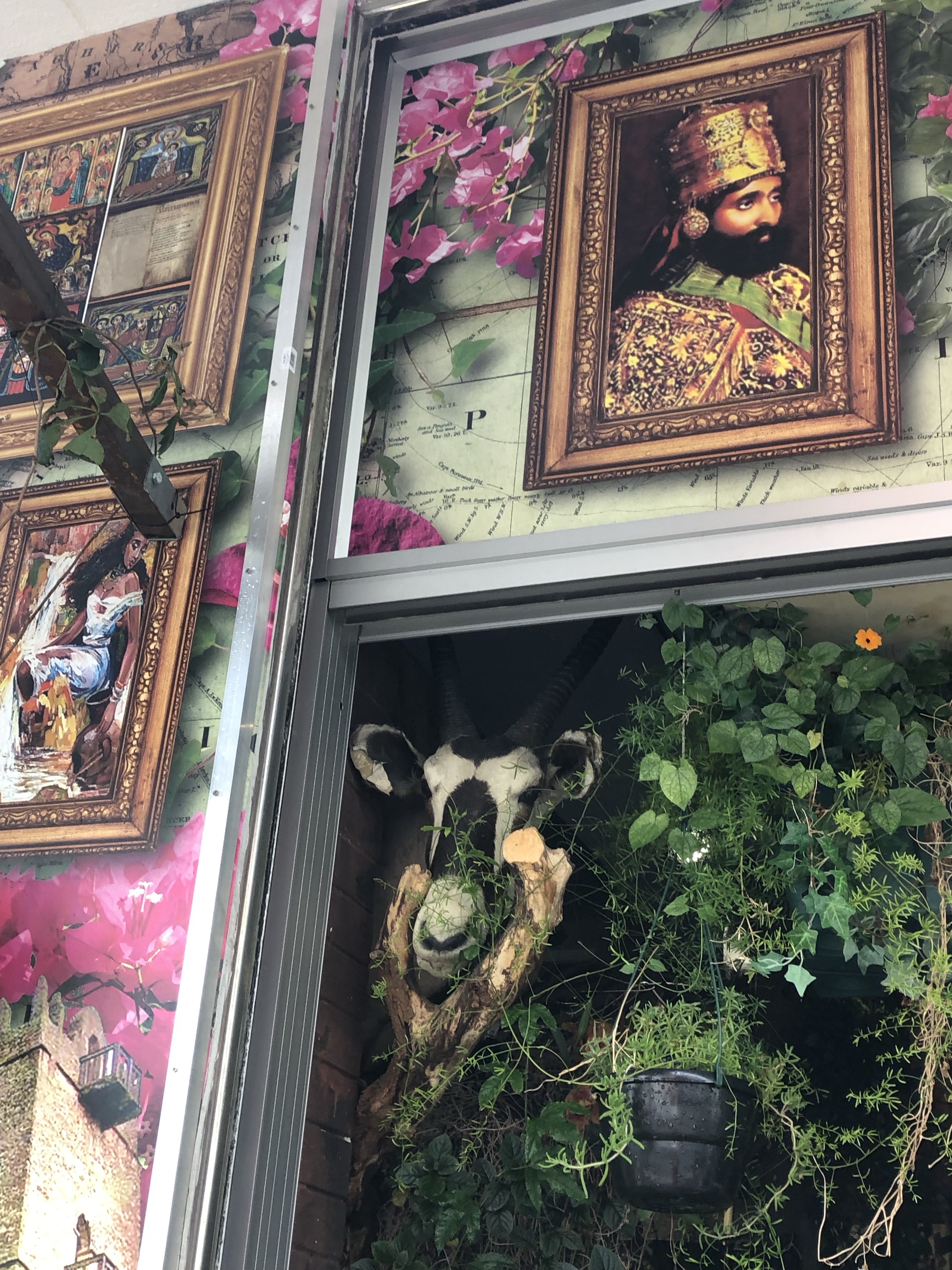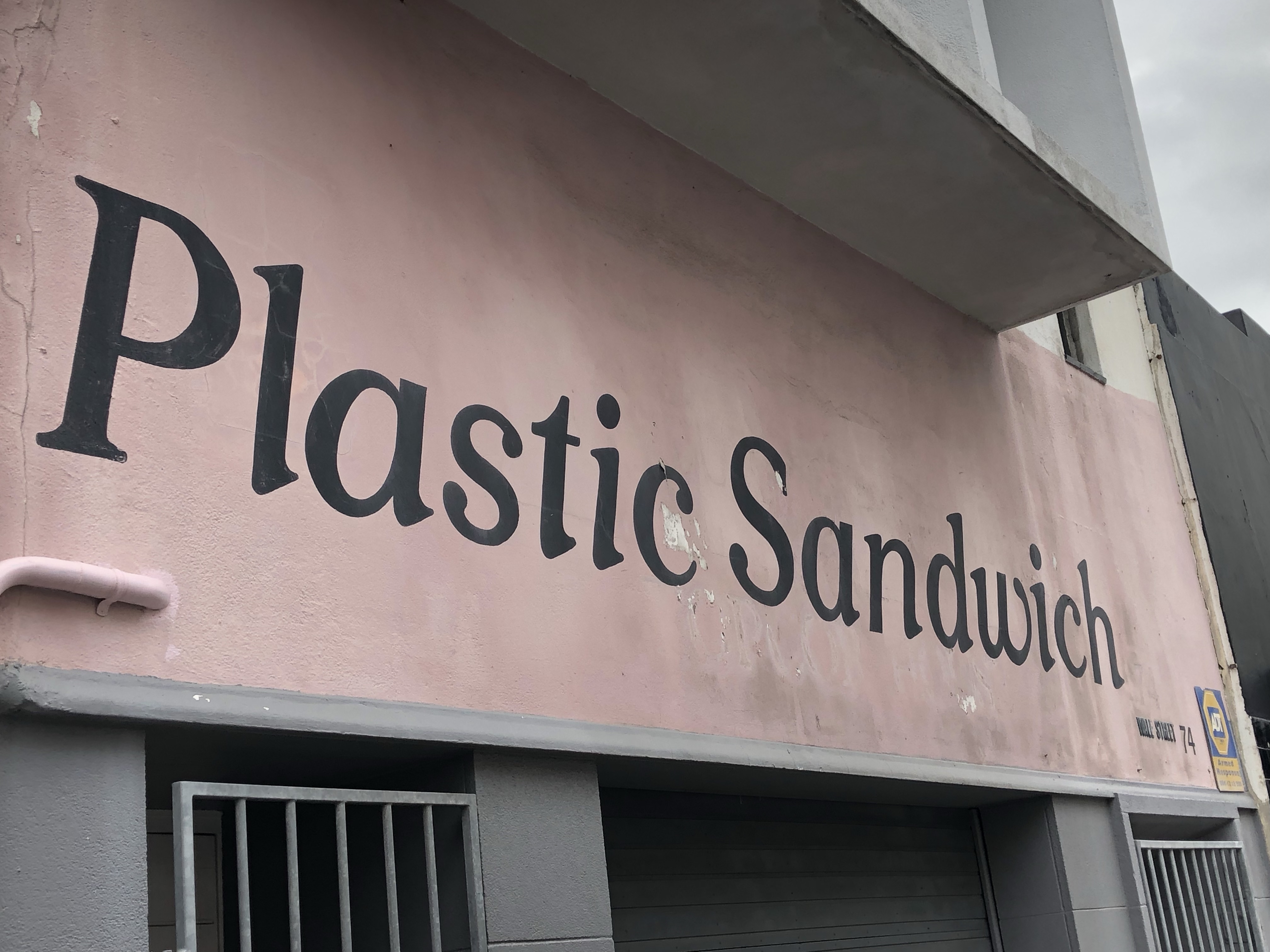 Nein, das Plastic Sandwich finde ich an einen nahen Hauswand. Doch ist der original Tierkopf im Fenster des Cafés befremdlich und wir schauen zweimal.