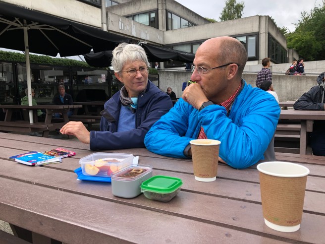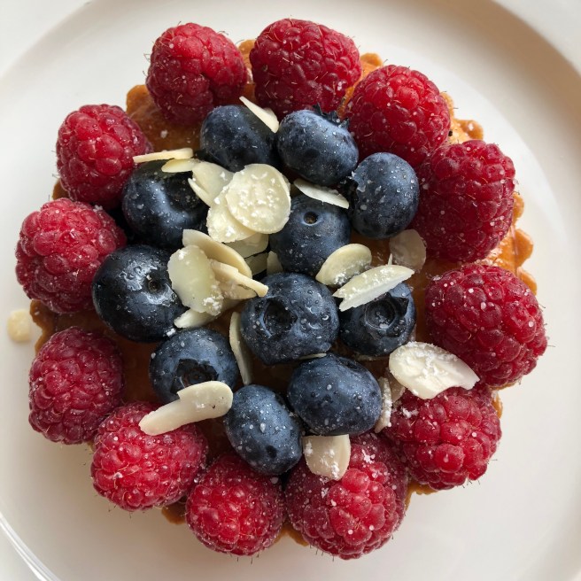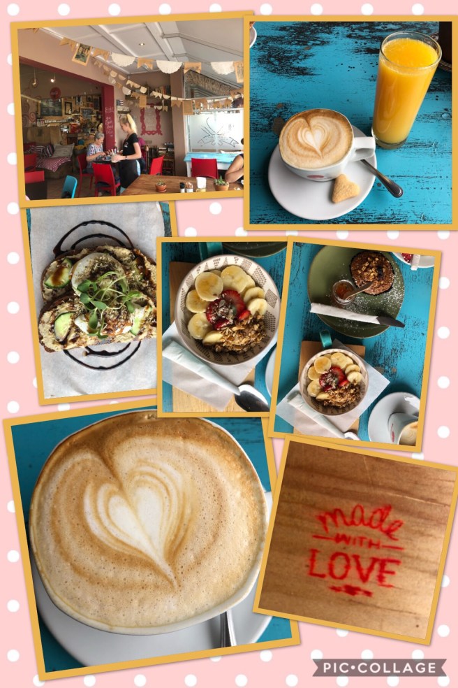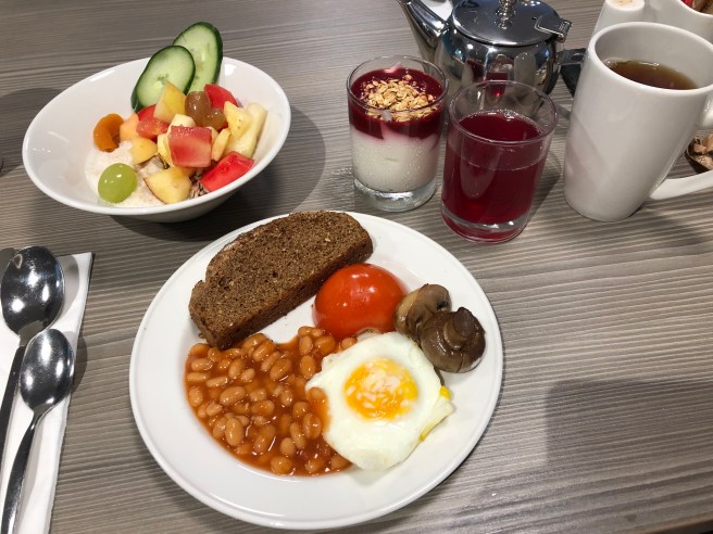 Ich bleibe bei meiner Bowl mit warmen Müsli. Sandra wählt wieder Egg, Bacon und Brown Toast. Die superleckeren Torten in der Vitrine locken. So gibt es zur Tagesstärkung noch ein Stück fluffigen Möhrenkuchen.