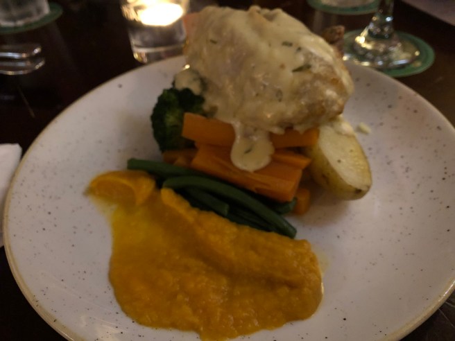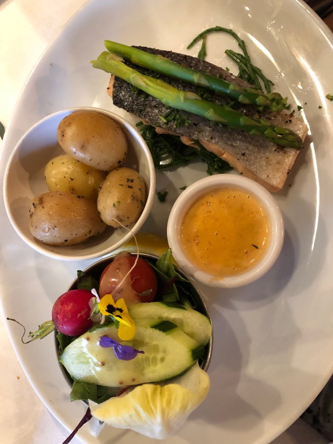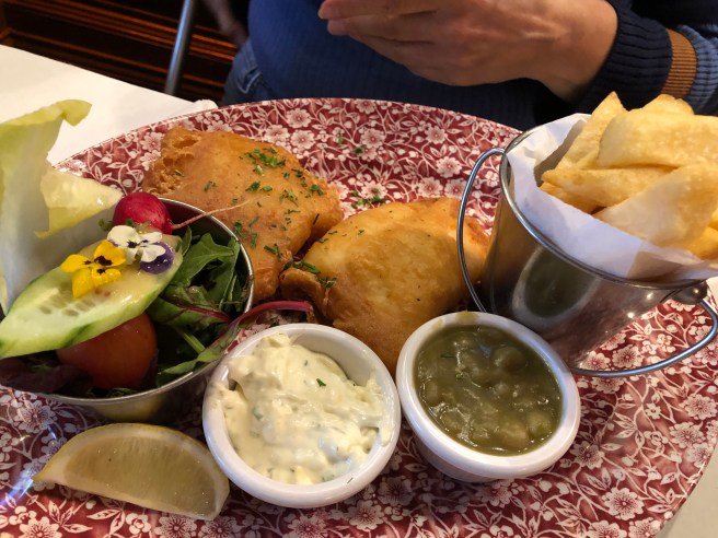 Ich bestelle Hake mit Chips. Fish and Chips hatten wir doch gerade in Irland. Lecker. Ganz frisch und gegrillt hat es mir sehr gut gemundet.