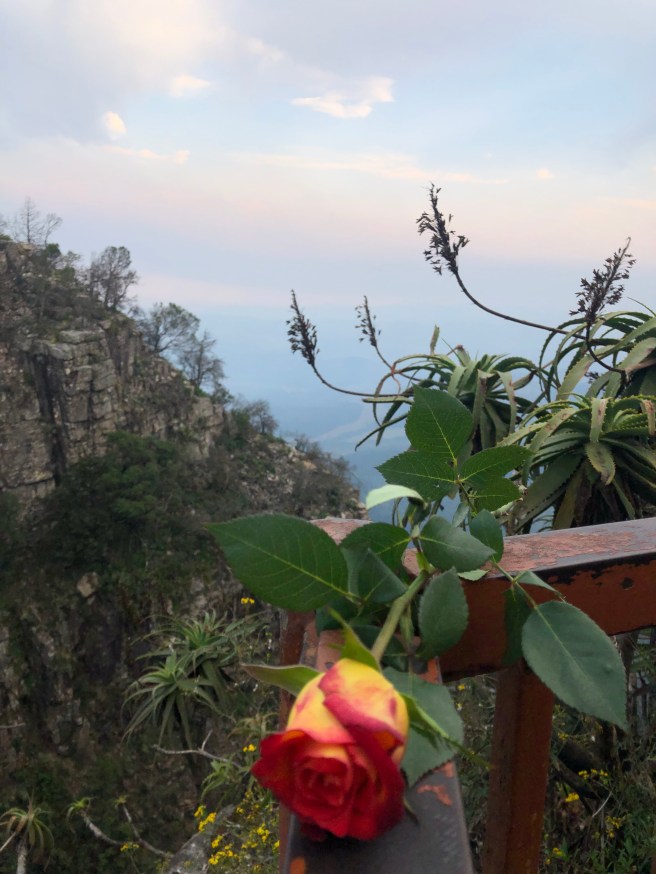 Im Anschluss fahren wir noch mal 1 km zurück. Die Brücke über den Storms River bietet einen beeindruckenden Blick in den tiefen Canyon. Sandra traut sich kaum hinunter zu sehen. Hier wachsen weiße große Calla. Wunderschön. Hier entdeckt Sandra die ersten F.C. Hansa Aufkleber. Sie hatte sie schon vermisst.