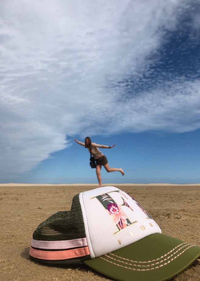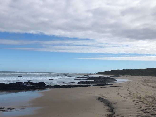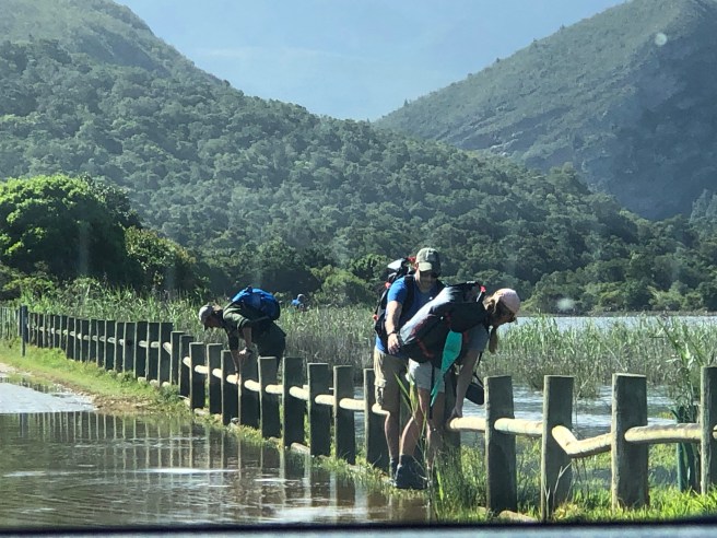 Eine kleine Straße schlängelt sich dann hinunter zum Ocean Richtung Nature’s Valley. Links die Lagune, rechts Felsen und der Ozean , wild und blau vor uns. Die Wellen rauschen nur so auf den leeren Strand. Wir passieren eine mit Wasser überflutete Stelle. Links Lagune, rechts See. Na, ob das gut geht? Sandra fährt langsam durch und wir kommen mit Unterbodenwäsche am Strandparkplatz an und sind restlos begeistert. Traumhafte Landschaft. Die Wellen rollen mit lautem Grollen zum Strand, wo sie sanft brechen.