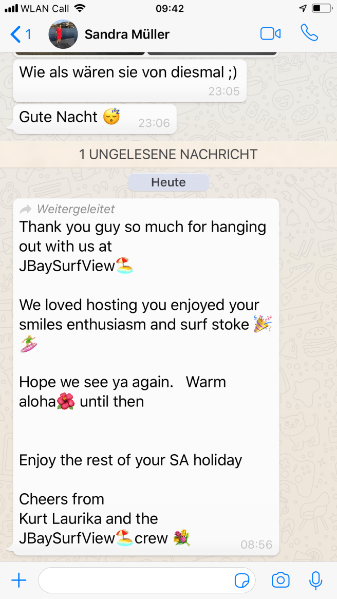 Beim Frühstück erhalten wir von Kurt noch eine wirklich schöne Danke WhatsApp