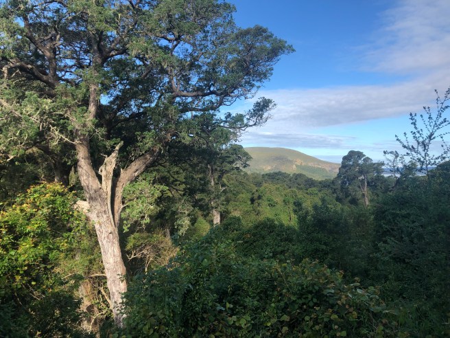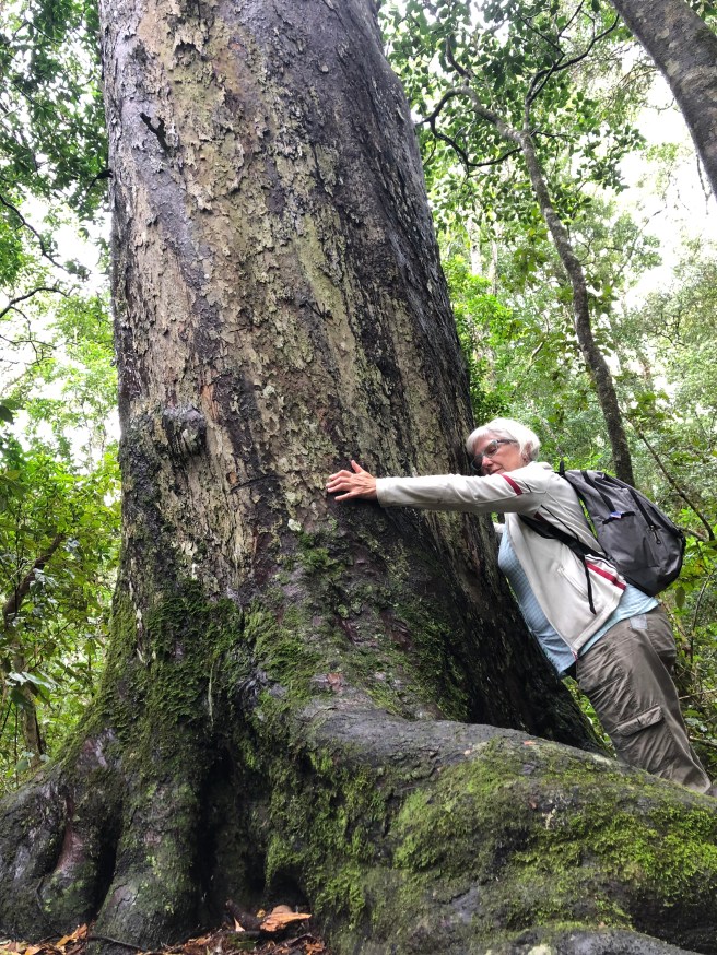 Das erste mal, dass wir etliche Busse antreffen. Bus wird ausgekippt, Touris aus …. Deutschland / Sachsen … überschwemmen den Holzsteg bis zum Baum. So wandern wir zunächst durch den Regenwald. Zum Glück hat es aufgehört zu regnen. Es tröpfelt nur aus dem Blätterdach. Eine laute Kakophonie umgibt uns. Auch hier stehen alte Yellowwood Trees. Vielleicht keine 800 Jahre alt, doch auch wunderschön anzusehen. Wir üben uns im „Waldbaden“ . Ist ja gerade total angesagt in der Entspannungs Szene. Umarmen Bäume