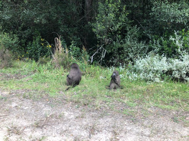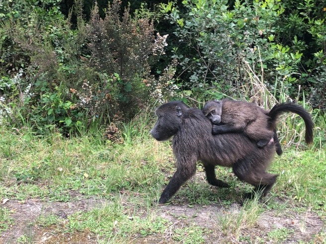 Zum zweiten Mal treffen wir auf wild lebende Affen. Bonobos? Kleine Familien laufen am Strassenrand vorbei. Die Babies auf dem Rücken.
